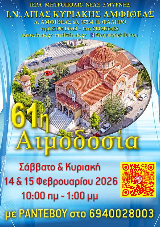 Ο Ιερός Ναός Αγίας Κυριακής Αμφιθέας, της Ιεράς Μητροπόλεως Νέας Σμύρνης, διοργανώνει την 61η Αιμοδοσία του και προσκαλεί τους ενορίτες και κάθε ενδιαφερόμενο σε μια πράξη αγάπης και προσφοράς προς τον συνάνθρωπο.