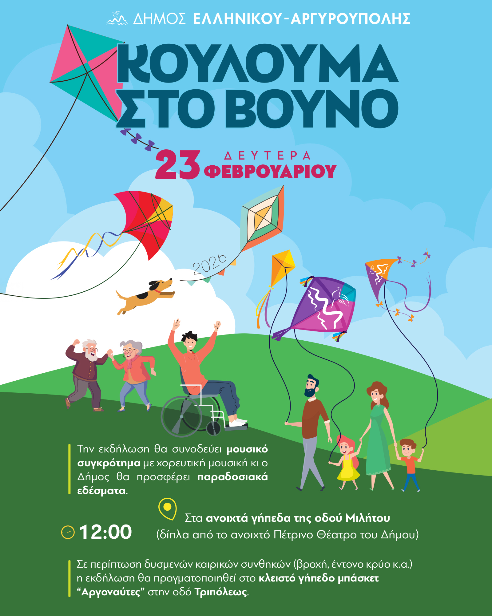 Διοργανώνει μία κεφάτη και ξεσηκωτική για μικρούς και μεγάλους, εκδήλωση με θέμα «Κούλουμα στο Βουνό» και προσκαλεί δημότες αλλά και επισκέπτες από άλλες γειτονιές της Αττικής, στα ανοιχτά γήπεδα της οδού Μιλήτου (δίπλα από το ανοιχτό Πέτρινο Θέατρο Αργυρούπολης) για να γιορτάσουν την Καθαρά Δευτέρα.