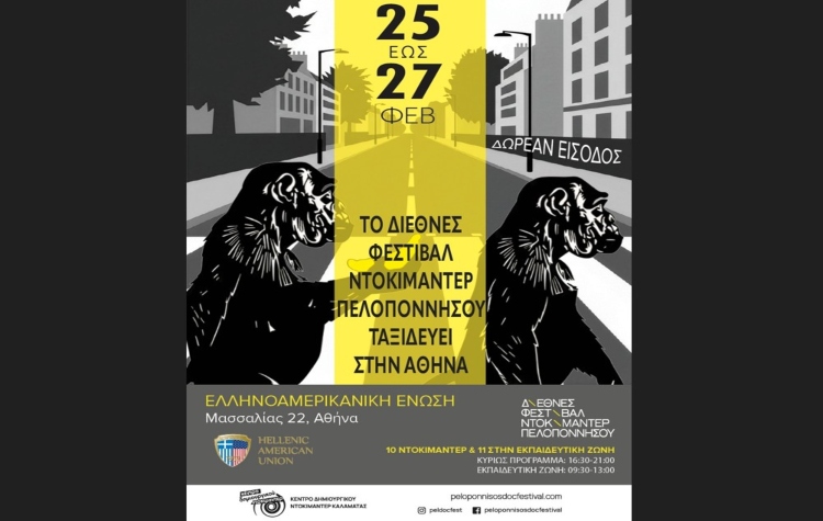 Με αθηναϊκές πρεμιέρες, τρεις διεθνείς προσκεκλημένους και μαθητικές προβολές, το Διεθνές Φεστιβάλ Ντοκιμαντέρ Πελοποννήσου και η Ελληνοαμερικανική Ένωση σας προσκαλούν σε ένα συναρπαστικό τριήμερο προβολών από τις 25 έως τις 27 Φεβρουαρίου, στην καρδιά της Αθήνας, στο Θέατρο της Ελληνοαμερικανικής Ένωσης (Μασσαλίας 22). Η είσοδος στις προβολές είναι ελεύθερη.