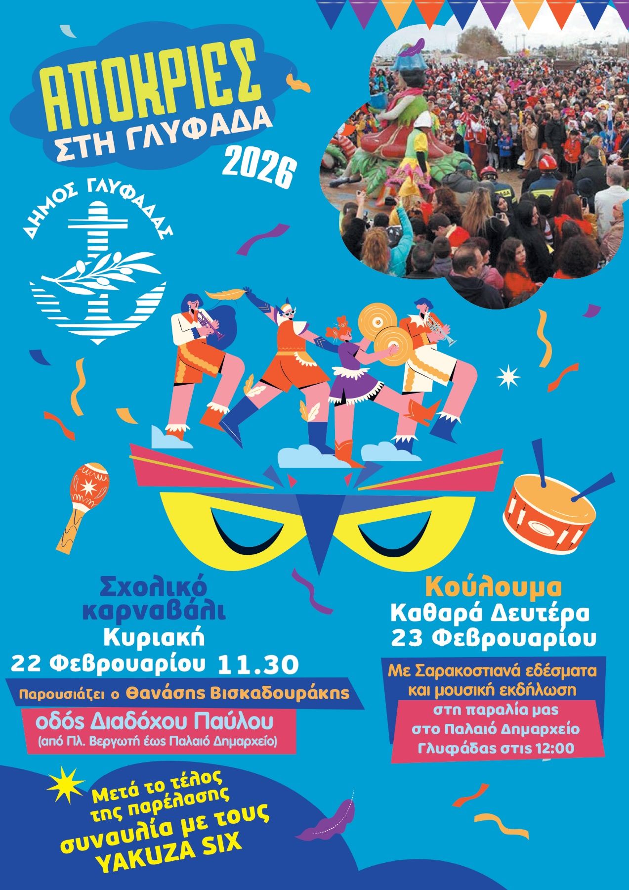 Ο Δήμος Γλυφάδας ανανεώνει το αποκριάτικο ραντεβού του για φέτος για την Κυριακή 22 Φεβρουαρίου, που θα πραγματοποιηθεί σε αποκριάτικους ρυθμούς το Σχολικό Καρναβάλι της πόλης.