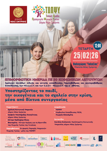 Ειδικότερα, η Τοπική Ομάδα Προαγωγής Ψυχικής Υγείας (ΤΟΠΨΥ) του Δήμου διοργανώνει μία επιμορφωτική ημερίδα για τους κοινωνικούς λειτουργούς των σχολικών μονάδων ειδικής και γενικής εκπαίδευσης (Πρωτοβάθμιας και Δευτεροβάθμιας Εκπαίδευσης), των ΚΕ.Δ.Α.Σ.Υ. και των Σ.Δ.Ε.Υ. – ΚΕ.Δ.Α.Σ.Υ. της Δ΄ Αθήνας, σε συνεργασία με τη σύμβουλο εκπαίδευσης Γεωργία Μπουλέτη.