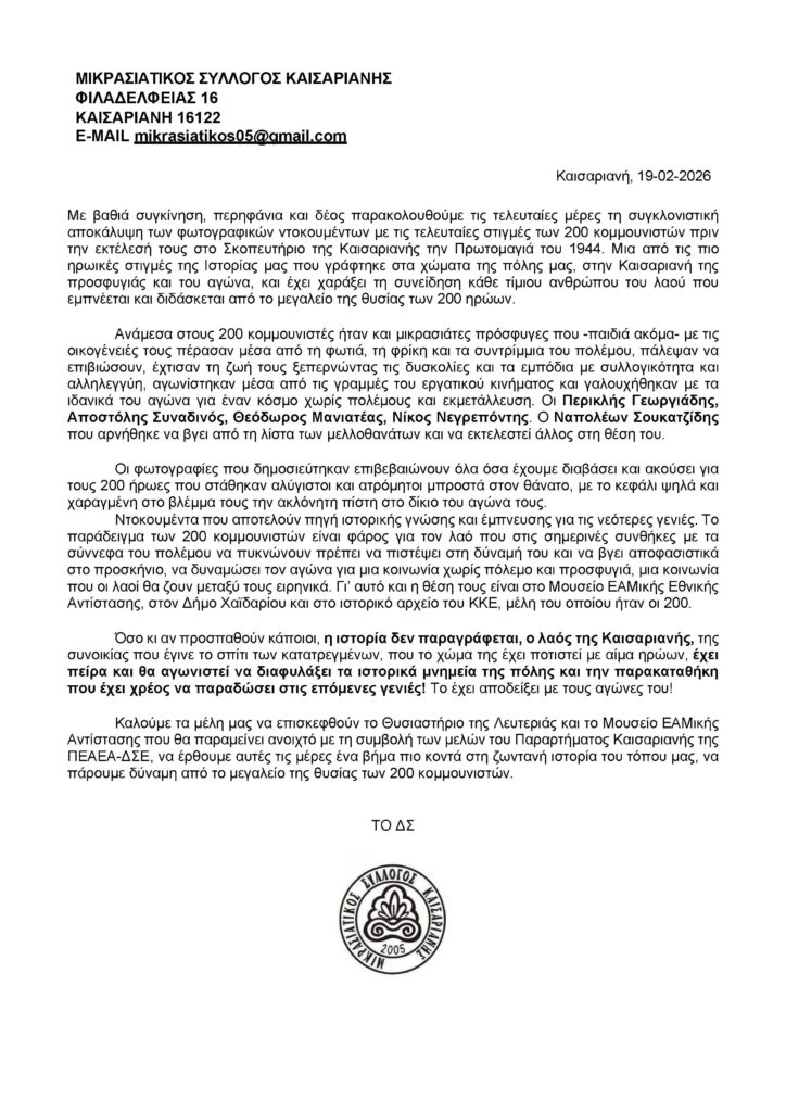 Στα φωτογραφικά ντοκουμέντα από τη θυσία των 200 κομουνιστών, που ήρθαν τις τελευταίες ημέρες στο «φως» της δημοσιότητας, αναφέρθηκε με σχετική ανακοίνωσή του, ο Μικρασιατικός Σύλλογος Καισαριανής.