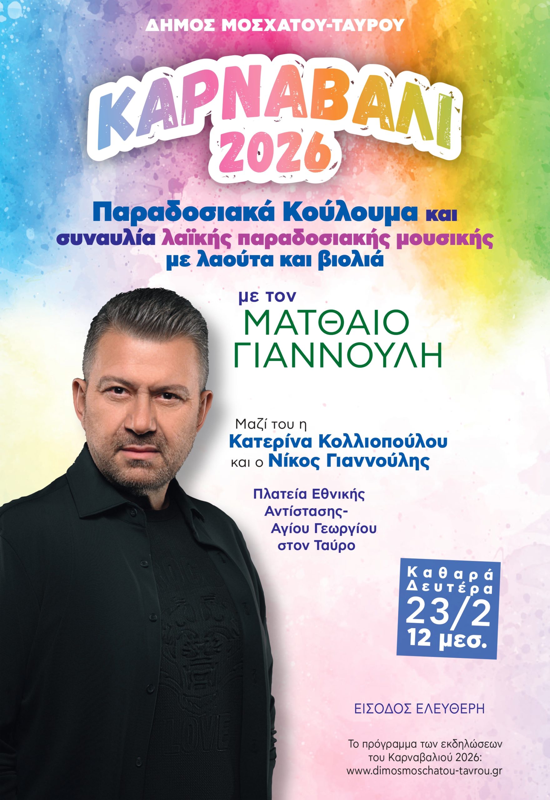 Με παραδοσιακό γλέντι και με τη συναυλία του Ματθαίου Γιαννούλη, κορυφώνονται οι καρναβαλικές εκδηλώσεις του Δήμου Μοσχάτου Ταύρου.