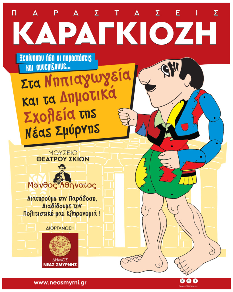 Σε εξέλιξη είναι αυτή την περίοδο στα νηπιαγωγεία της Νέας Σμύρνης, οι παραστάσεις Θεάτρου Σκιών (Καραγκιόζη) του «Μάνθου Αθηναίου», φέρνοντας σε επαφή με την λαϊκή παράδοση του Καραγκιόζη τους μικρούς θεατές της πόλης.
