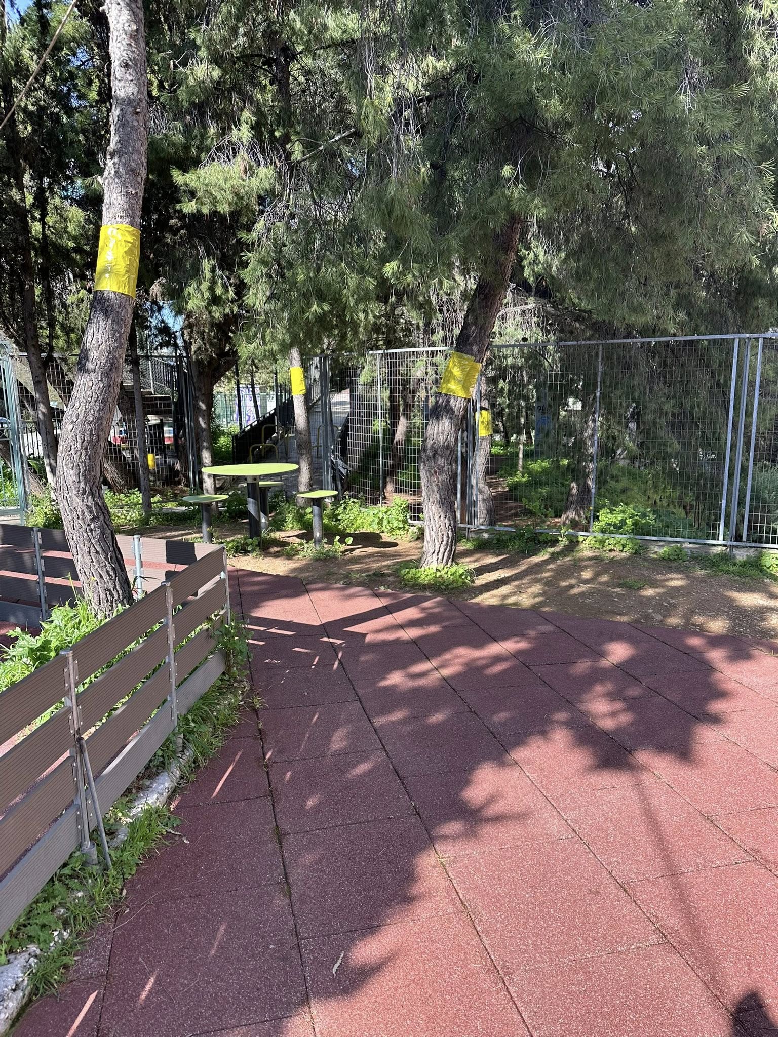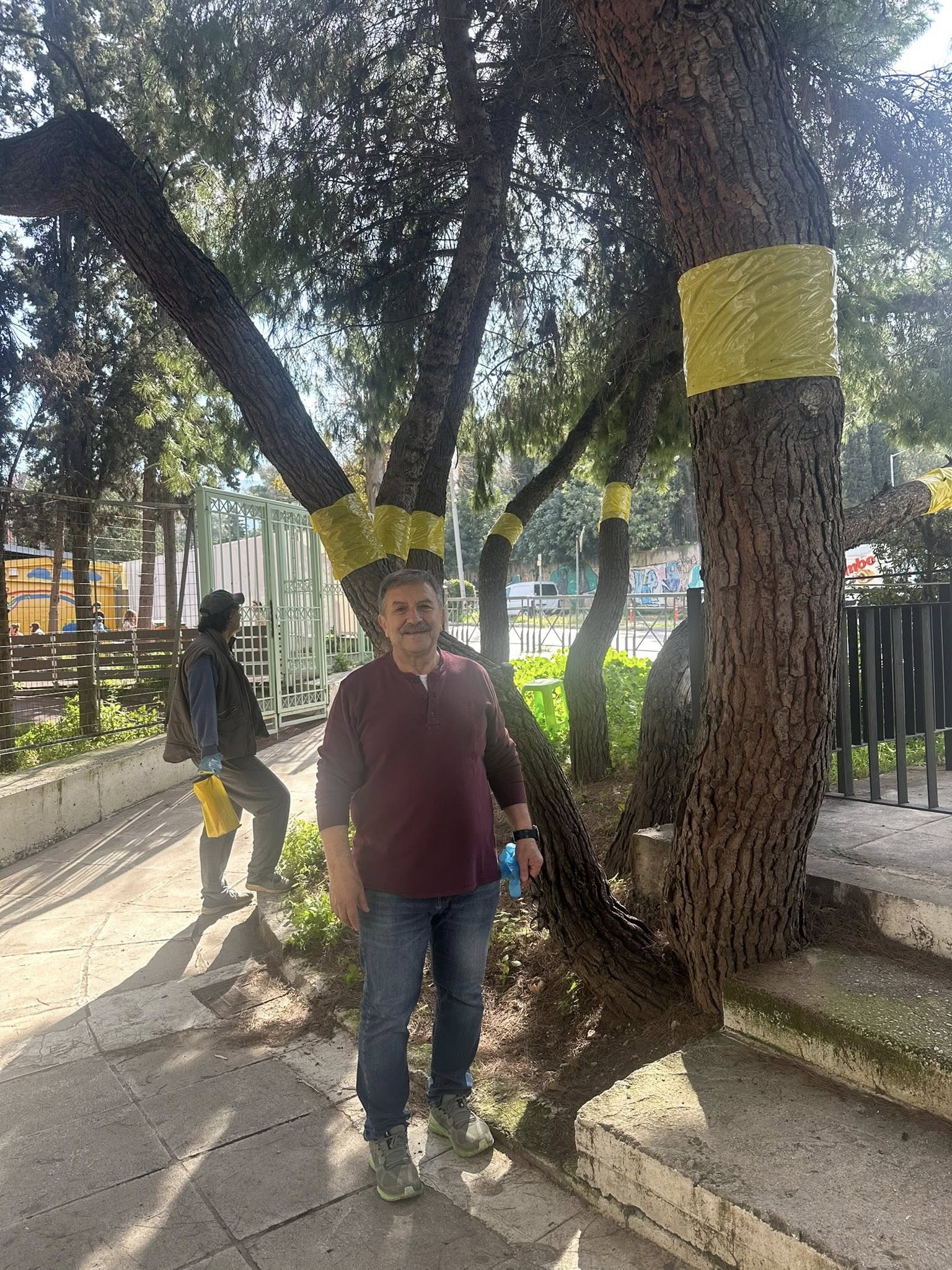 Ειδικότερα, ο Δήμος προχώρησε στην τοποθέτηση ειδικών κίτρινων κολλητικών ταινιών στους κορμούς πεύκων σε διάφορα σημεία της πόλης, με στόχο τον περιορισμό της καθόδου των καμπιών.