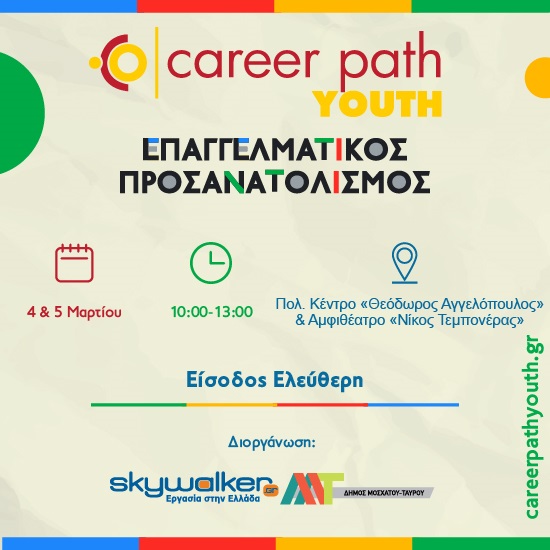 Με επίκεντρο τη στήριξη των μαθητών στη μετάβασή τους από το σχολείο στις σπουδές και την αγορά εργασίας, ο Δήμος Μοσχάτου-Ταύρου φιλοξενεί το διήμερο σεμινάριο επαγγελματικού προσανατολισμού #CareerPathYouth, σε συνεργασία με το skywalker.gr.