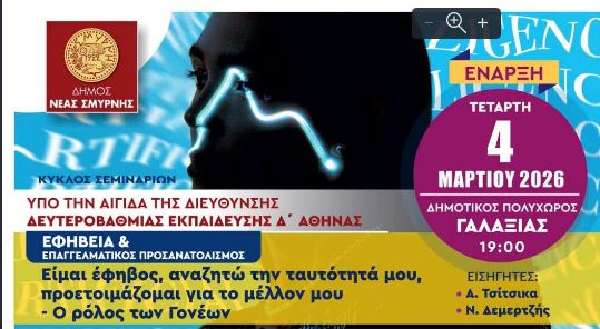 Ένα ιδιαίτερα επίκαιρο σεμινάριο με τίτλο «Είμαι έφηβος, αναζητώ την ταυτότητά μου, προετοιμάζομαι για το μέλλον μου – Ο ρόλος των γονέων» διοργανώνεται την Τετάρτη 4 Μαρτίου, στις 19:00 στον Δημοτικό Πολυχώρο «Γαλαξίας» στη Νέα Σμύρνη.