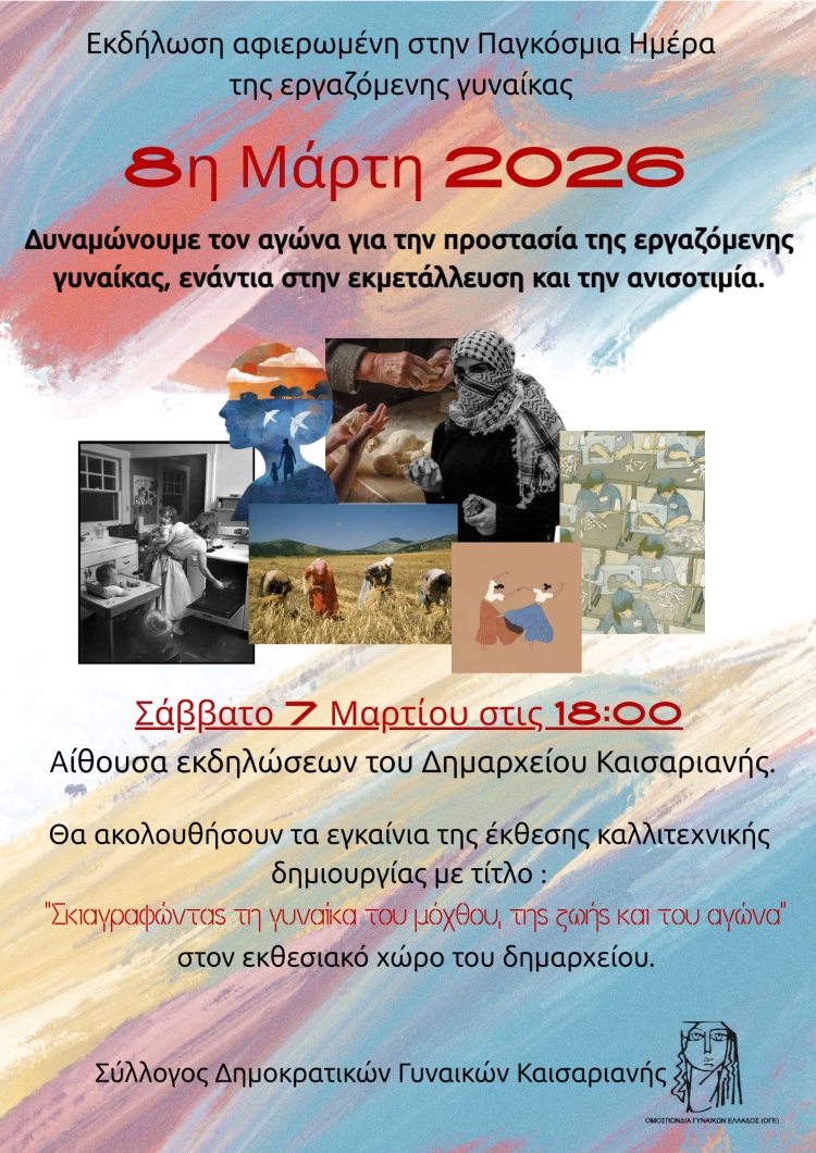 Μία εκδήλωση αφιερωμένη στην Παγκόσμια Ημέρα της Εργαζόμενης Γυναίκας διοργανώνει  ο Σύλλογος Δημοκρατικών Γυναικών Καισαριανής, με τίτλο «Δυναμώνουμε τον αγώνα για την προστασία της εργαζόμενης γυναίκας, ενάντια στην εκμετάλλευση και την ανισοτιμία».