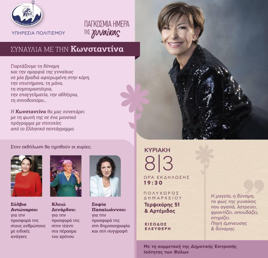 Με πρωταγωνίστρια της βραδιάς την Κωνσταντίνα την οποία το κοινό θα έχει την ευκαιρία να απολαύσει σε μία και μοναδική συναυλία με την Κωνσταντίνα, ερμηνεύοντας δικές της – και όχι μόνο – επιτυχίες.