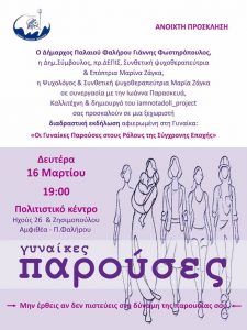 Ανοιχτή πρόσκληση στο κοινό για μια διαδραστική εκδήλωση αφιερωμένη στη σύγχρονη γυναίκα απευθύνει ο Δήμος Παλαιού Φαλήρου, με θέμα «Οι Γυναίκες Παρούσες στους Ρόλους της Σύγχρονης Εποχής».