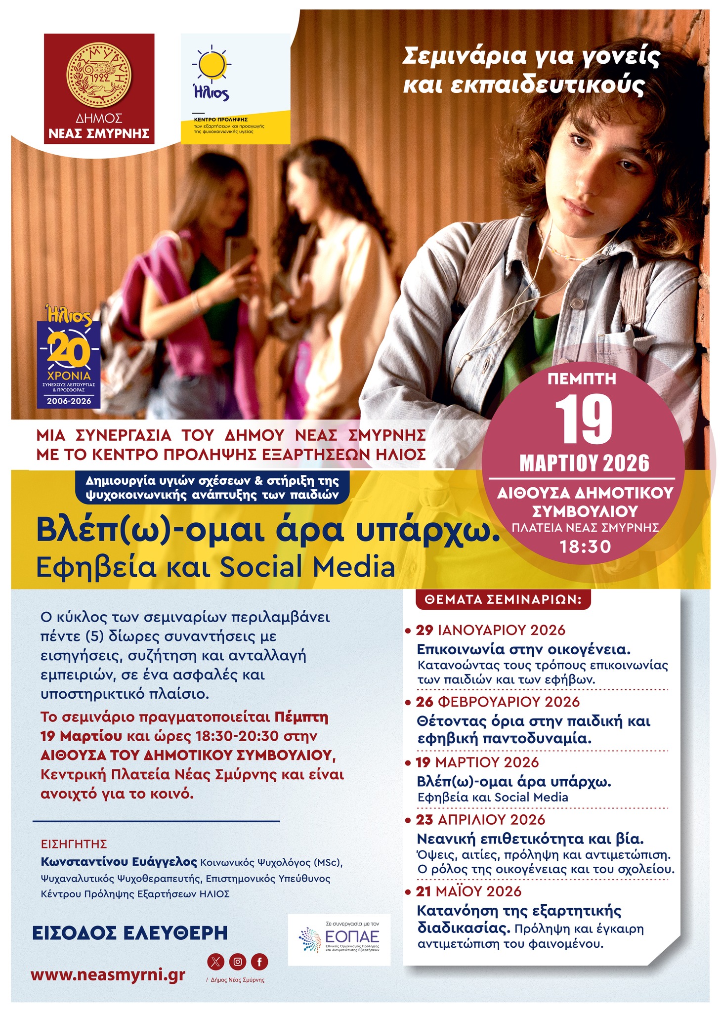 Συνεχίζεται ο κύκλος σεμιναρίων του Κέντρου Πρόληψης Εξαρτήσεων «ΗΛΙΟΣ», με το 3ο σεμινάριο για γονείς και επαιδευτικούς να επικεντρώνεται στο θέμα «Βλέπ(ω)-μαι άρα υπάρχω. Εφηβεία και Social Media».