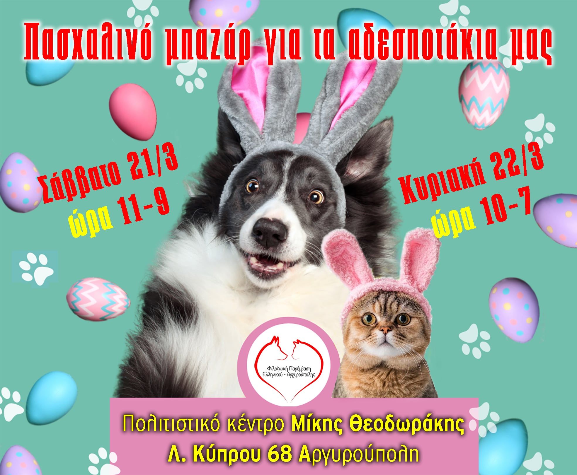 Το Πασχαλινό Μπαζάρ της διοργανώνει η Φιλοζωικής Παρέμβασης Ελληνικού – Αργυρούπολης, με στόχο την ενίσχυση της δράσης της στην φροντίδα των αδέσποτων ζώων της πόλης και την κάλυψη των αναγκών τους σε τροφή, φάρμακα και περίθαλψη.