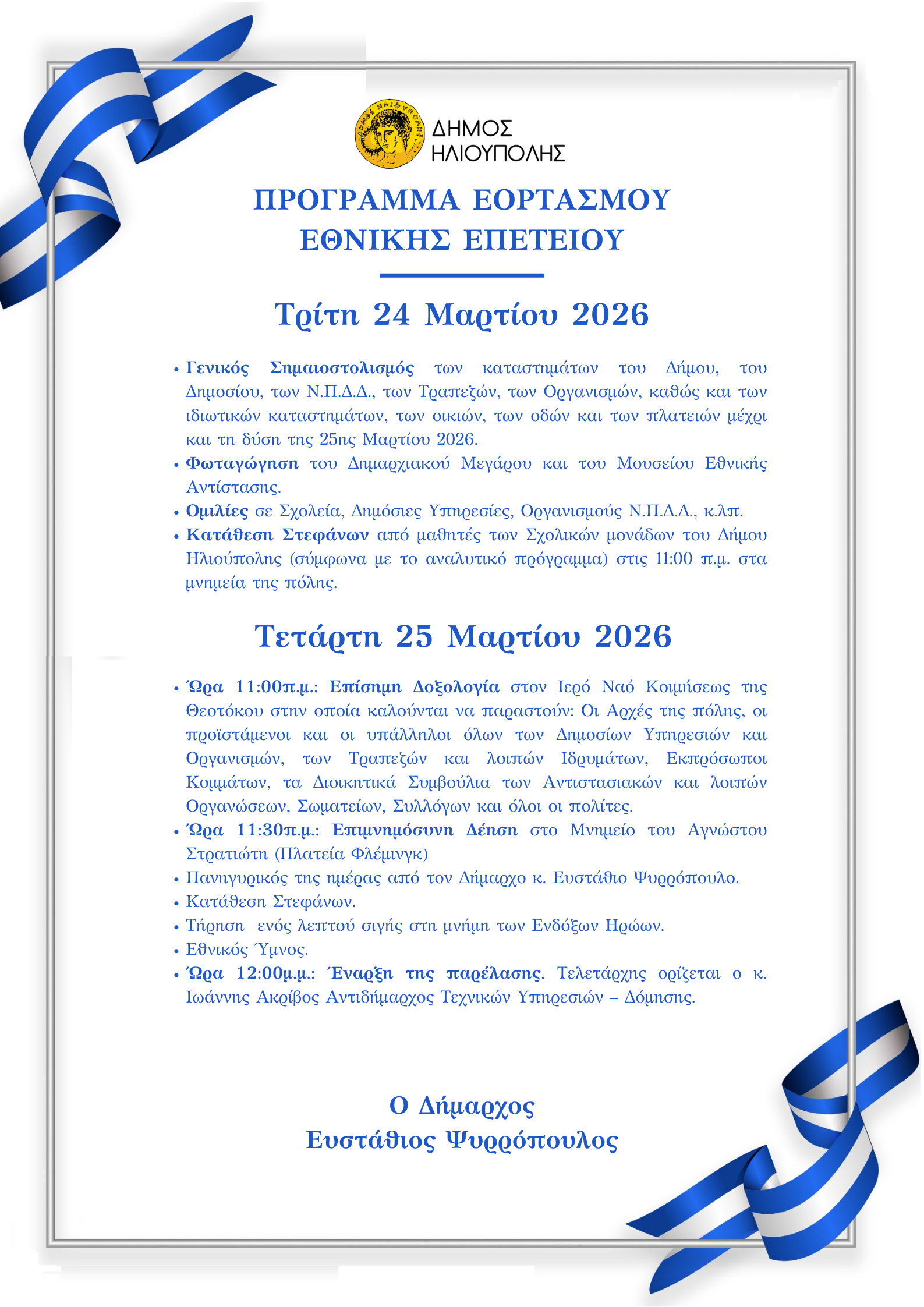 Ο δήμαρχος Στάθης Ψυρρόπουλος απευθύνει ανοιχτό κάλεσμα σε όλους τους πολίτες να τιμήσουν με την παρουσία τους τις εκδηλώσεις.
