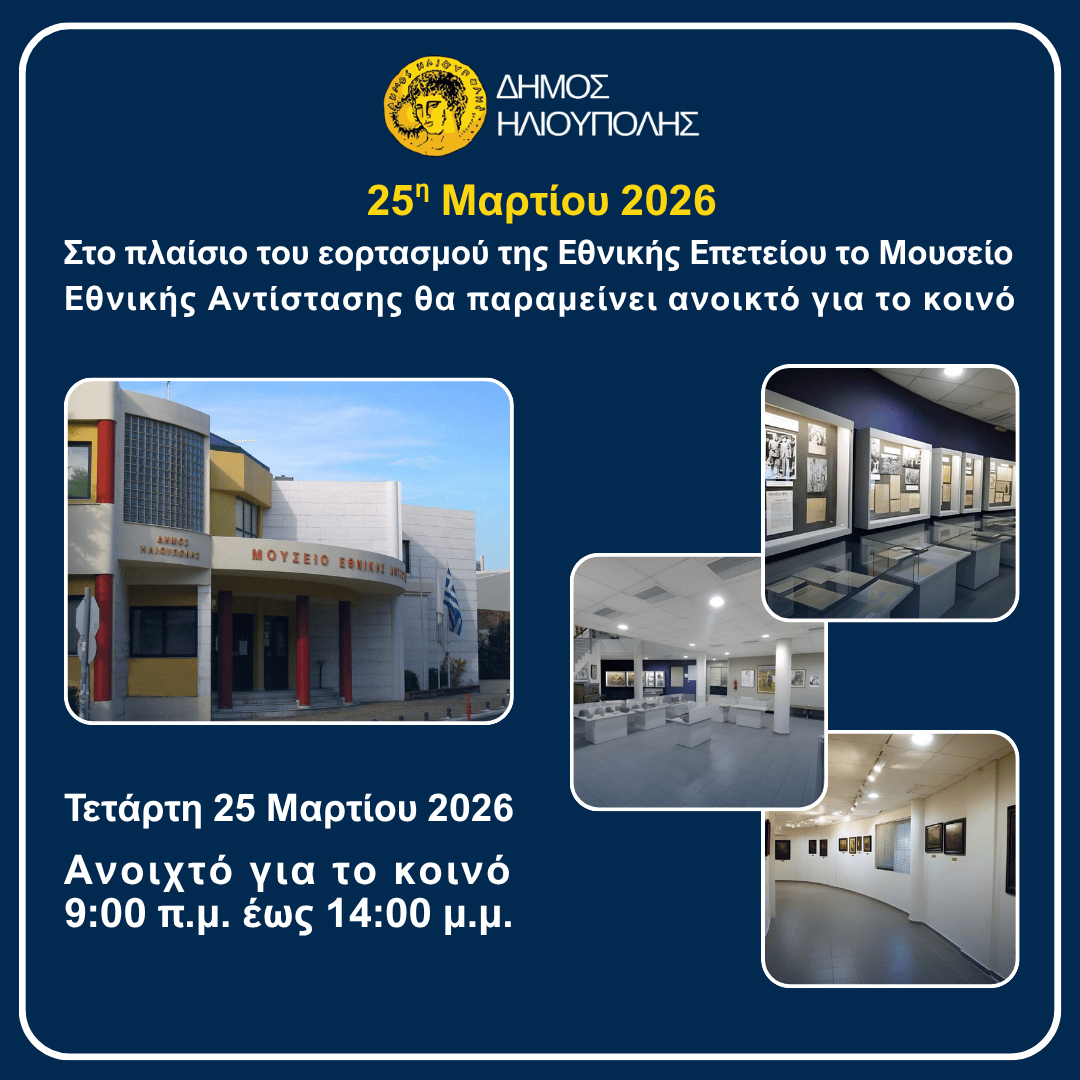 Αξίζει να σημειωθεί πως στο πλαίσιο του εορτασμού της Εθνικής Επετείου της 25ης Μαρτίου, το Μουσείο Εθνικής Αντίστασης θα παραμείνει ανοικτό για το κοινό την Τετάρτη, 25 Μαρτίου 2026, προσκαλόντας τους πολίτες να τιμήσουν την ιστορική μνήμη και να περιηγηθούν στις συλλογές του, οι οποίες αναδεικνύουν τους αγώνες για ελευθερία και ανεξαρτησία.