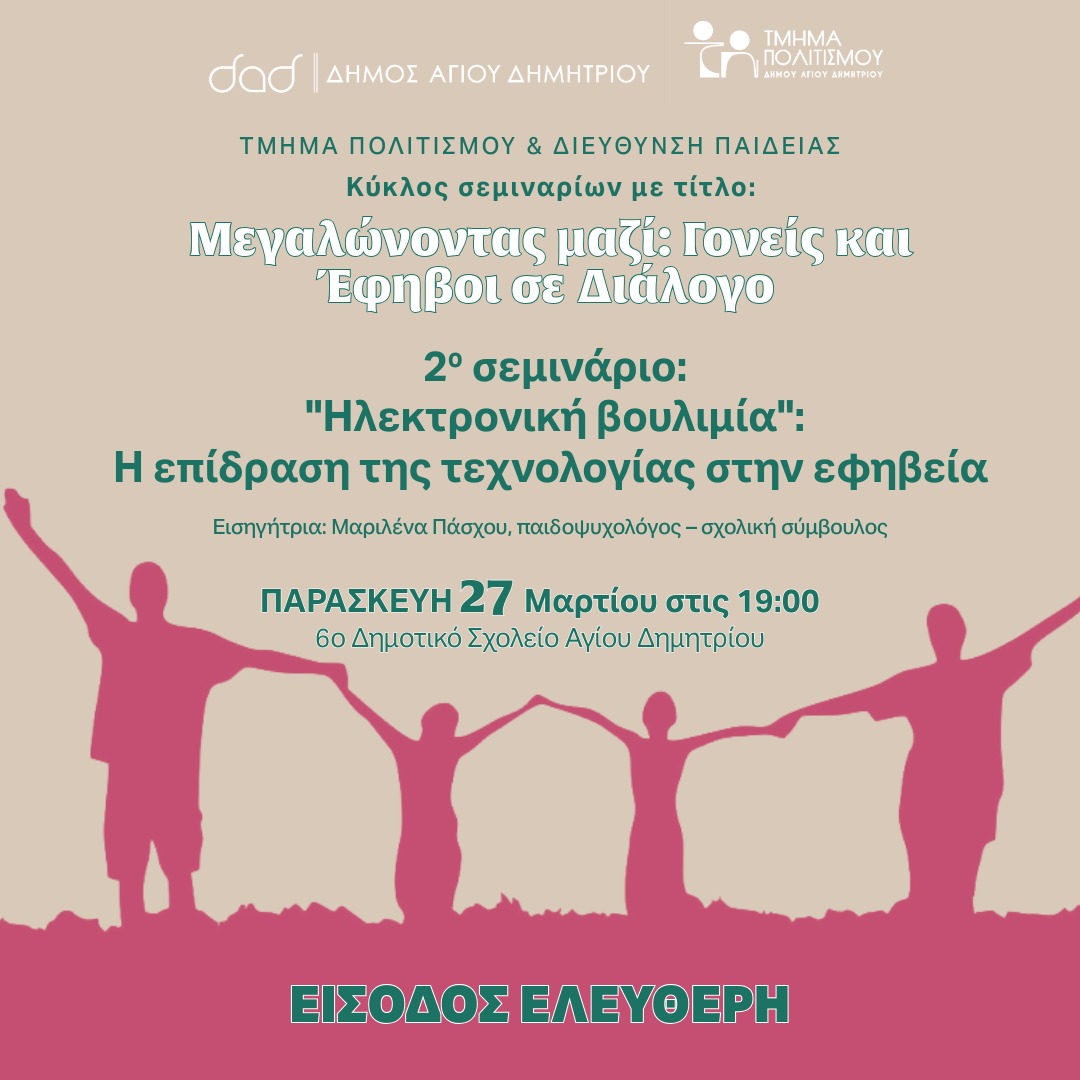 Συνεχίζεται ο κύκλος σεμιναρίων του Δήμου Αγίου Δημητρίου με στόχο την ενίσχυση της επικοινωνίας μεταξύ γονιών και εφήβων, μέσα από τη δεύτερη συνάντηση με τίτλο «Ηλεκτρονική βουλιμία – Η επίδραση της τεχνολογίας στην εφηβεία».