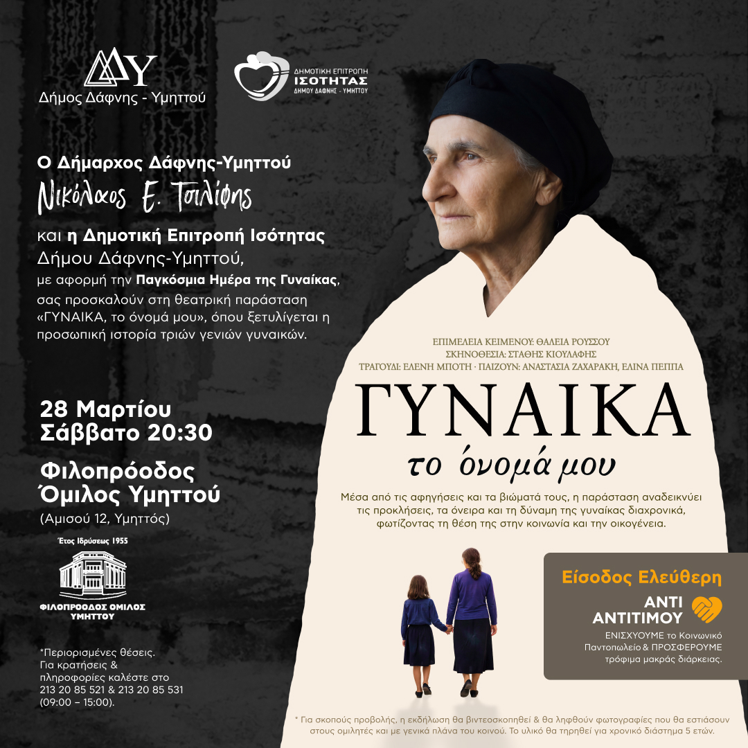 Στο πλαίσιο εορτασμού της Παγκόσμιας Ημέρας της Γυναίκας, η Δημοτική Επιτροπή Ισότητας του Δήμου Δάφνης Υμηττού, το Σάββατο 28 Μαρτίου 2026 στις 20:30 παρουσιάζει τη θεατρική παράσταση «Γυναίκα, το όνομά μου», όπου ξετυλίγεται η ιστορία τριών γενιών γυναικών.