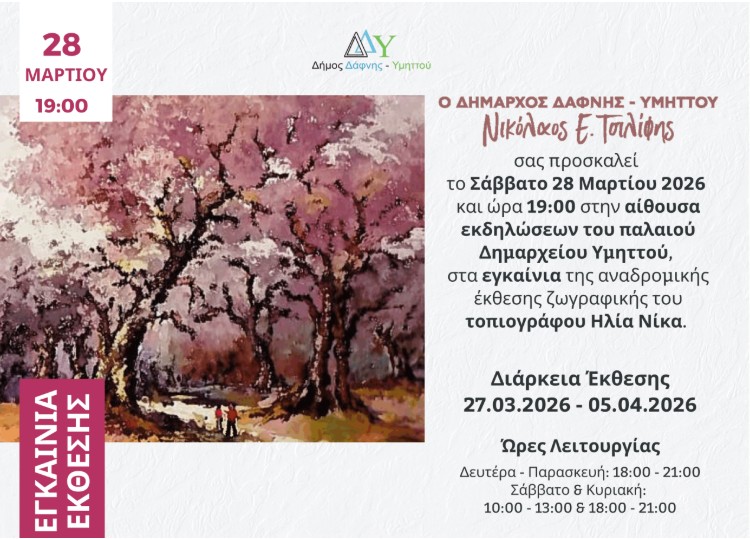 Το Σάββατο 28 Μαρτίου 2026, στις 19:00 στην αίθουσα εκδηλώσεων του παλαιού Δημαρχείου Υμηττού, εγκαινιάζεται η αναδρομική έκθεση ζωγραφικής του τοπιογράφου Ηλία Νίκα.