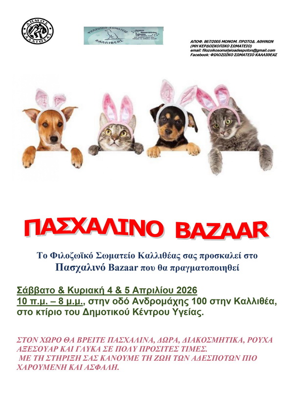 Το Φιλοζωϊκό Σωματείο Καλλιθέας διοργανώνει Πασχαλινό Bazaar το Σάββατο 4 και την Κυριακή 5 Απριλίου 2026, από τις 10:00 έως τις 20:00, στο κτίριο των Δημοτικών Ιατρείων (Ανδρομάχης 100, Καλλιθέα).