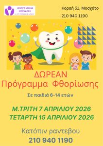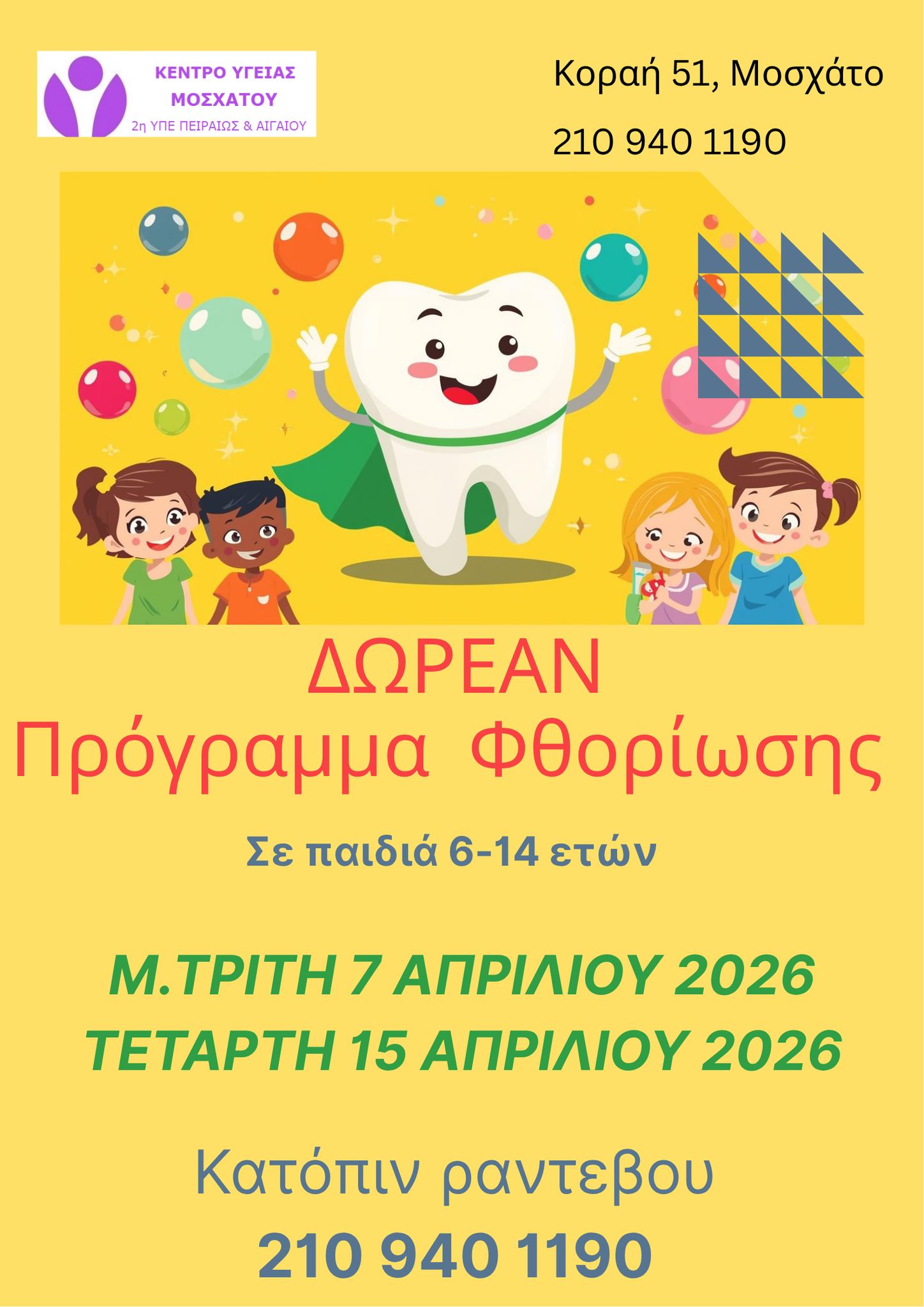 Το Κέντρο Υγείας Μοσχάτου προσφέρει δωρεάν πρόγραμμα φθορίωσης σε παιδιά από 6 έως 14 ετών.