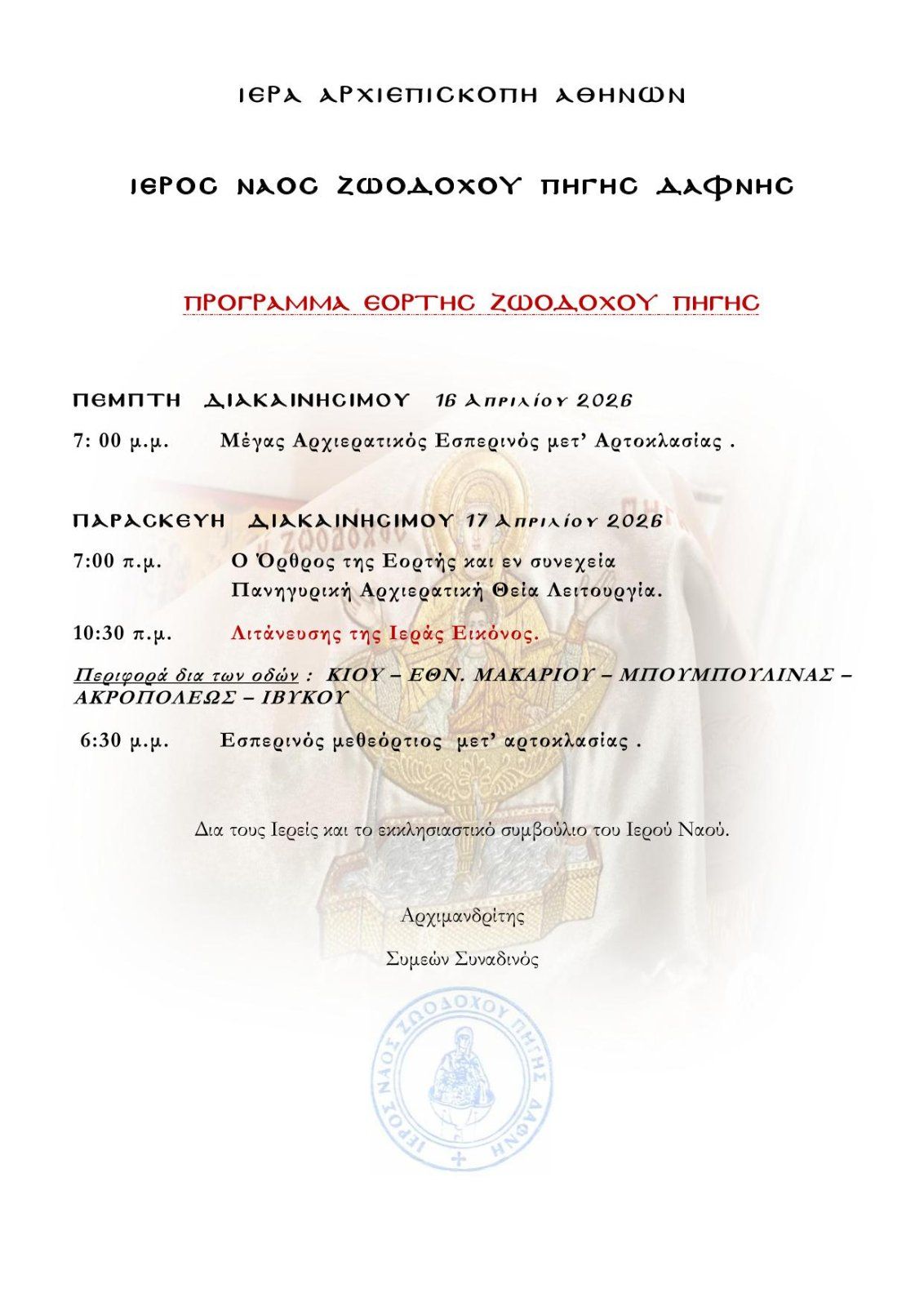 Το φετινό πρόγραμμα της πανηγύρεως ανακοίνωσε ο Ιερός Ναός Ζωοδόχου Πηγής Δάφνης, με τις εκδηλώσεις να πραγματοποιούνται την Πέμπτη και την Παρασκευή της Διακαινησίμου, 16 και 17 Απριλίου.