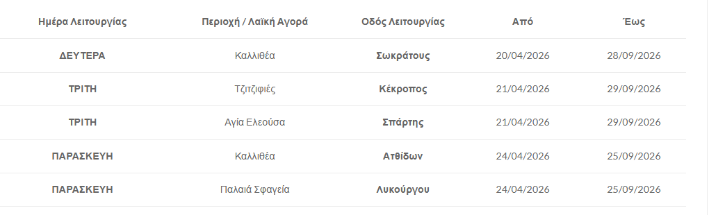 «Ο Δήμος Καλλιθέας ενημερώνει τους δημότες και τους κατοίκους της πόλης ότι, σύμφωνα με απόφαση της Περιφέρειας Αττικής, οι παρακάτω λαϊκές αγορές που λειτουργούν εντός των ορίων του Δήμου μας μετακινούνται από τις 20 Απριλίου 2026 έως τα τέλη Σεπτεμβρίου 2026».