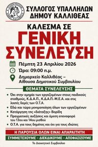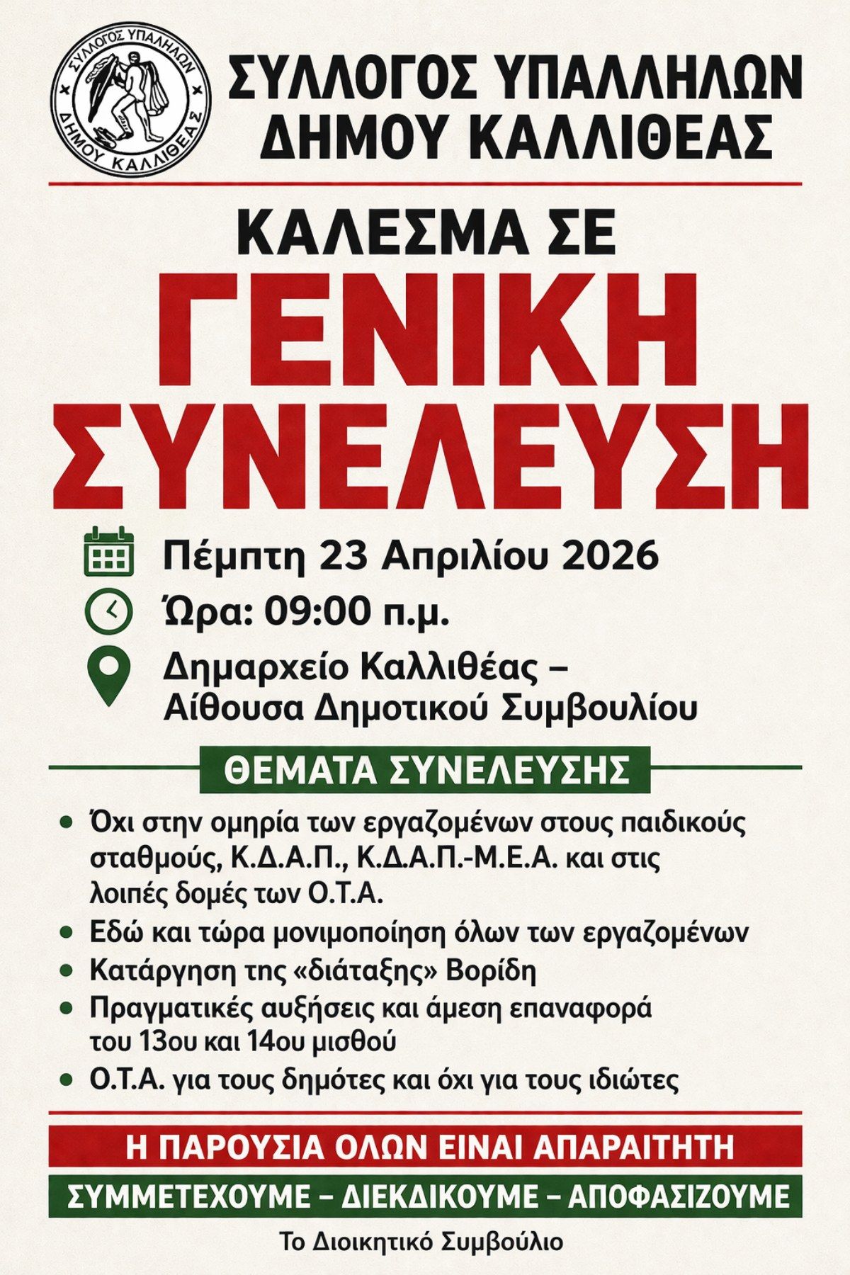 Ο Σύλλογος εργαζομένων Καλλιθέας θα πραγματοποιήσει Γενική Συνέλευση στο Δημαρχείο, στην αίθουσα του Δημοτικού Συμβουλίου, την Πέμπτη 23 Απριλίου και ώρα 9 π.μ..