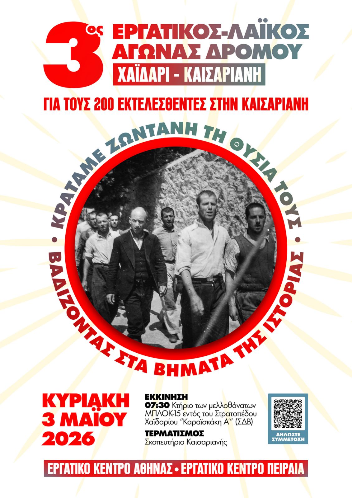 Εργατικά Κέντρα Αθήνας και Πειραιά διοργανώνουν τον λαϊκό αγώνα δρόμου για την Εργατική Πρωτομαγιά, τιμώντας τους 200 εκτελεσμένους κομμουνιστές στην Καισαριανή