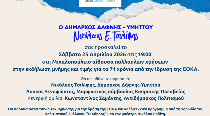 Επετειακή εκδήλωση μνήμης και τιμής για τα 71 χρόνια από την έναρξη του αγώνα της Εθνικής Οργάνωσις Κυπρίων Αγωνιστών (ΕΟΚΑ) διοργανώνει ο Δήμος Δάφνης – Υμηττού.
