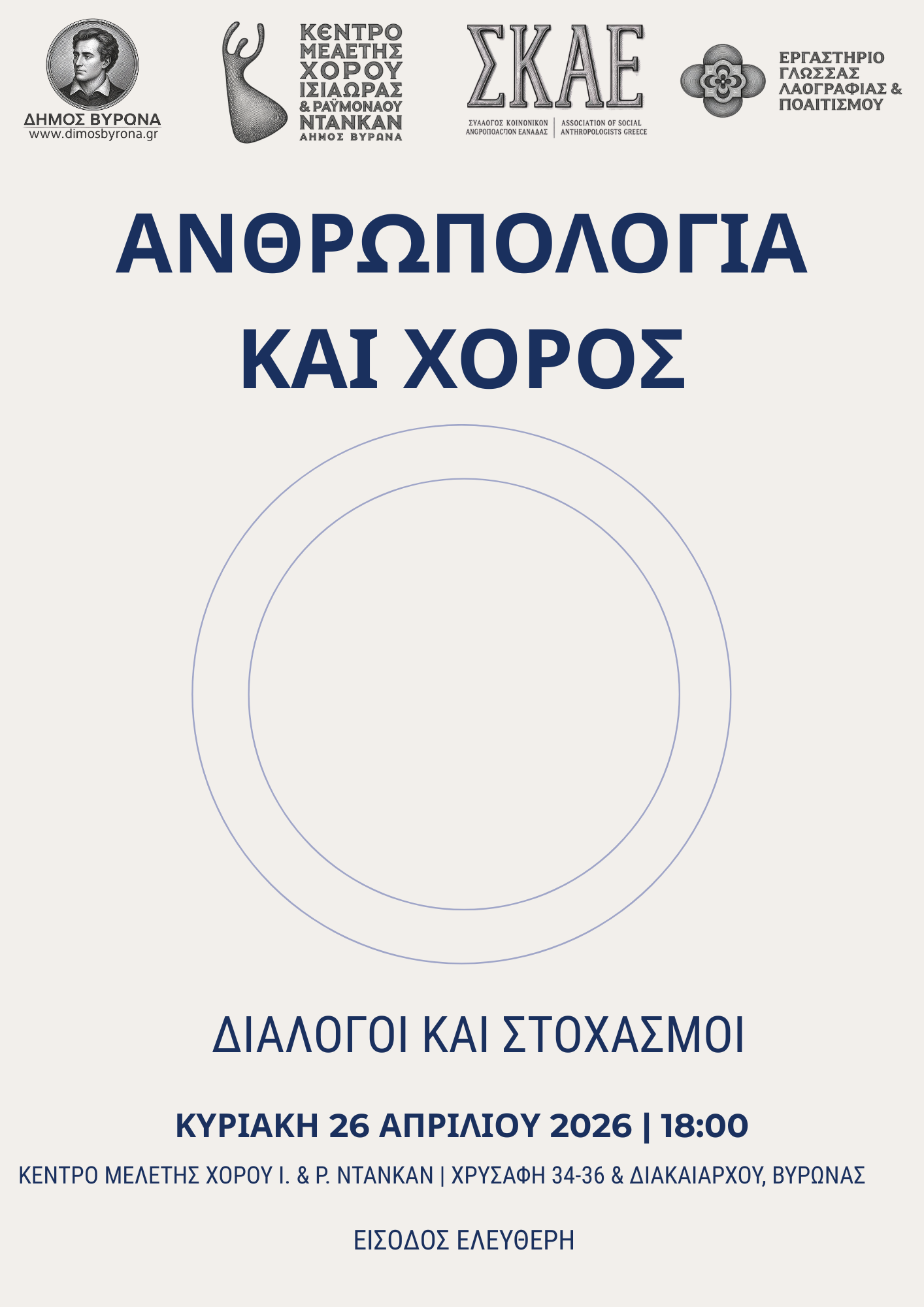 Με αφορμή την Παγκόσμια Ημέρα Χορού, διοργανώνεται την Κυριακή 26 Απριλίου στις 18:00 η εκδήλωση «Ανθρωπολογία και Χορός: Διάλογοι και Στοχασμοί», στο Κέντρο Μελέτης Χορού Ισιδώρας και Ραϋμόνδου Ντάνκαν.