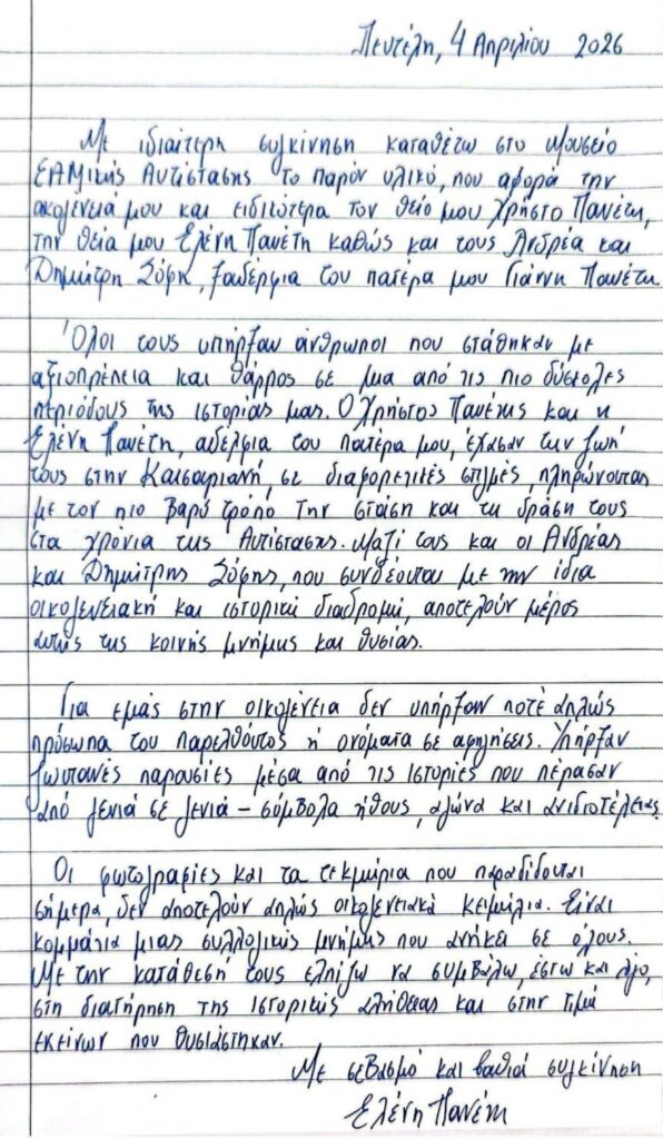«Με ιδιαίτερη συγκίνηση καταθέτω στο Μουσείο ΕΑΜικής Αντίστασης το παρόν υλικό, που αφορά την οικογένειά μου και ειδικότερα τον θείο μου Χρήστο Πανέτη, την θεία μου Ελένη Πανέτη καθώς και τους Ανδρέα και Δημήτρη Σόφη, ξαδέρφια του πατέρα μου Γιάννη Πανέτη. Όλοι τους υπήρξαν άνθρωποι που στάθηκαν με αξιοπρέπεια και θάρρος σε μία από τις πιο δύσκολες περιόδους της ιστορίας μας. Ο Χρήστος Πανέτης και η Ελένη Πανέτη, αδέλφια του πατέρα μου, έχασαν την ζωή τους στην Καισαριανή, σε διαφορετικές στιγμές, πληρώνοντας με τον πιο βαρύ τρόπο την στάση και τη δράση τους στα χρόνια της Αντίστασης. Μαζί τους και οι Ανδρέας και Δημήτρης Σόφης, που συνδέονται με την ίδια οικογενειακή και ιστορική διαδρομή, αποτελούν μέρος αυτής της κοινής μνήμης και θυσίας.