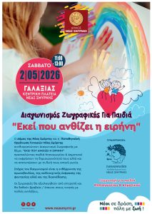 Διαγωνισμό παιδικής ζωγραφικής με θέμα «Εκεί που ανθίζει η Ειρήνη» διοργανώνει ο Δήμος Νέας Σμύρνης σε συνεργασία με την Παναθηναϊκή Οργάνωση Γυναικών Νέας Σμύρνης το Σάββατο 2 Μαΐου στον Δημοτικό Πολυχώρο «Γαλαξίας», ώρα 11:00-13:00.