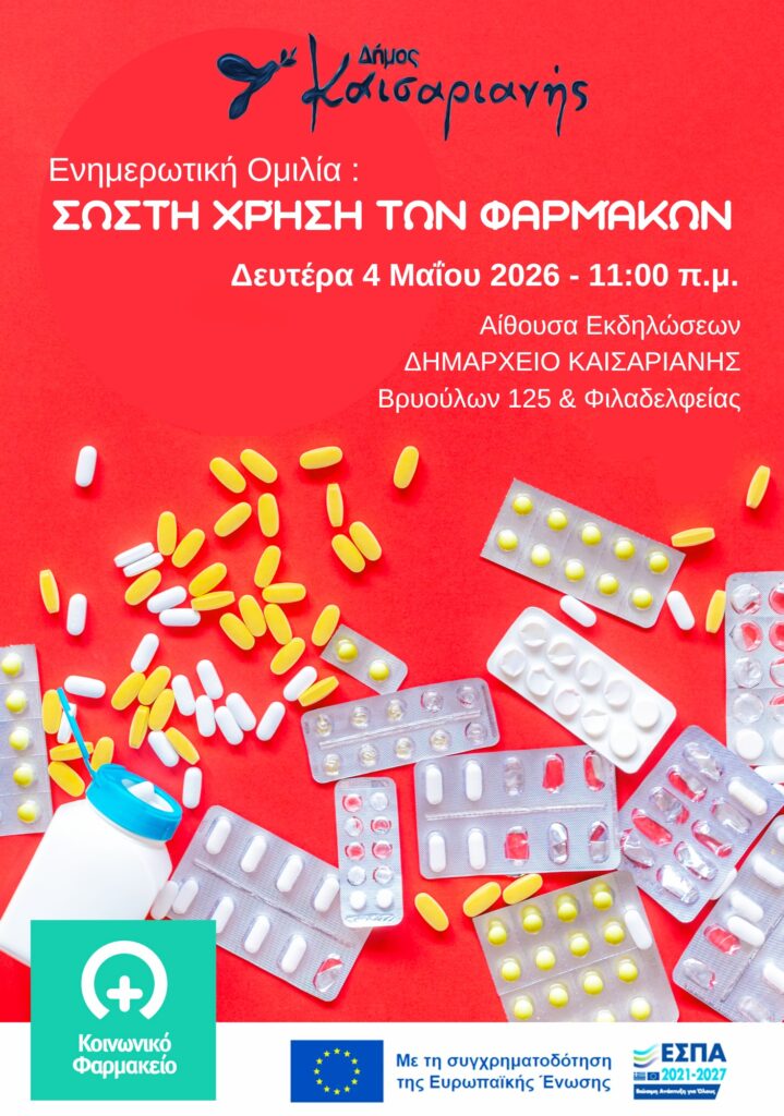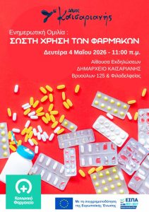Ενημερωτική ομιλία με θέμα τη σωστή χρήση των φαρμάκων διοργανώνει ο Δήμος τη Δευτέρα 4 Μαΐου 2026 και ώρα 11:00 το πρωί, στην αίθουσα εκδηλώσεων του Δημαρχείου της πόλης (Βρυούλων 125 & Φιλαδελφείας).