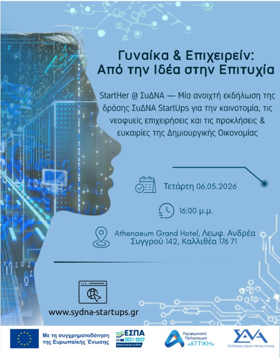 Ο Σύνδεσμος Δήμων Νότιας Αττικής (ΣυΔΝΑ) και η δράση Sydna StartUps διοργανώνουν την 2η Ανοιχτή Ημερίδα με τίτλο «Γυναίκα και Επιχειρείν: Από την Ιδέα στην Επιτυχία», η οποία θα πραγματοποιηθεί την Τετάρτη 6 Μαΐου 2026, στις 16:00, στο Athenaeum Grand Hotel Athens.